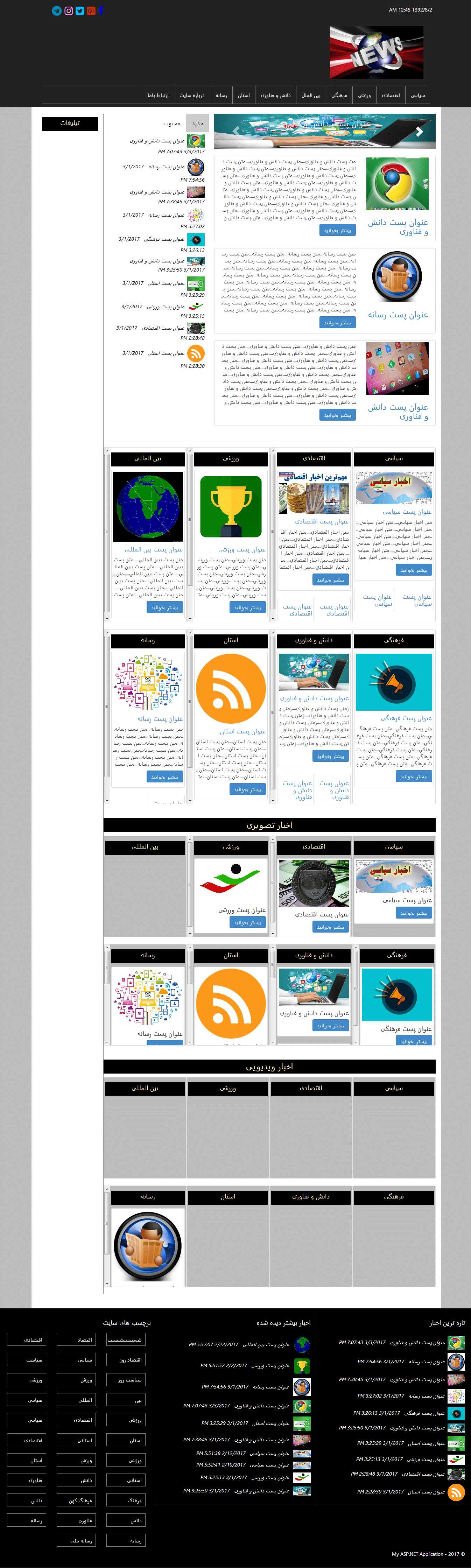 پروژه طراحی سایت خبری با هدف ارائه انواع اخبار متنی ,تصویری ,ویدیویی در انواع زمینه های سیاسی , اقتصادی ,استانی ,بین المللی , ورزشی ,رسانه ,  دانش و فناوری و… طراحی شده به علاوه امکان حذف و اضافه و ویرایش انواع داده های درون سایت از قبیل گروه بندی خبر ها , برچسب های استفاده شده در سایت , مطالب خبری و رسانه های استفاده شده  و… برای مدیر سایت در پنل مدیریت ارائه شده. به عبارت دیگر این پروژه تمامی امکانات یک وب سایت خبری را در اختیار شما قرار میدهد.