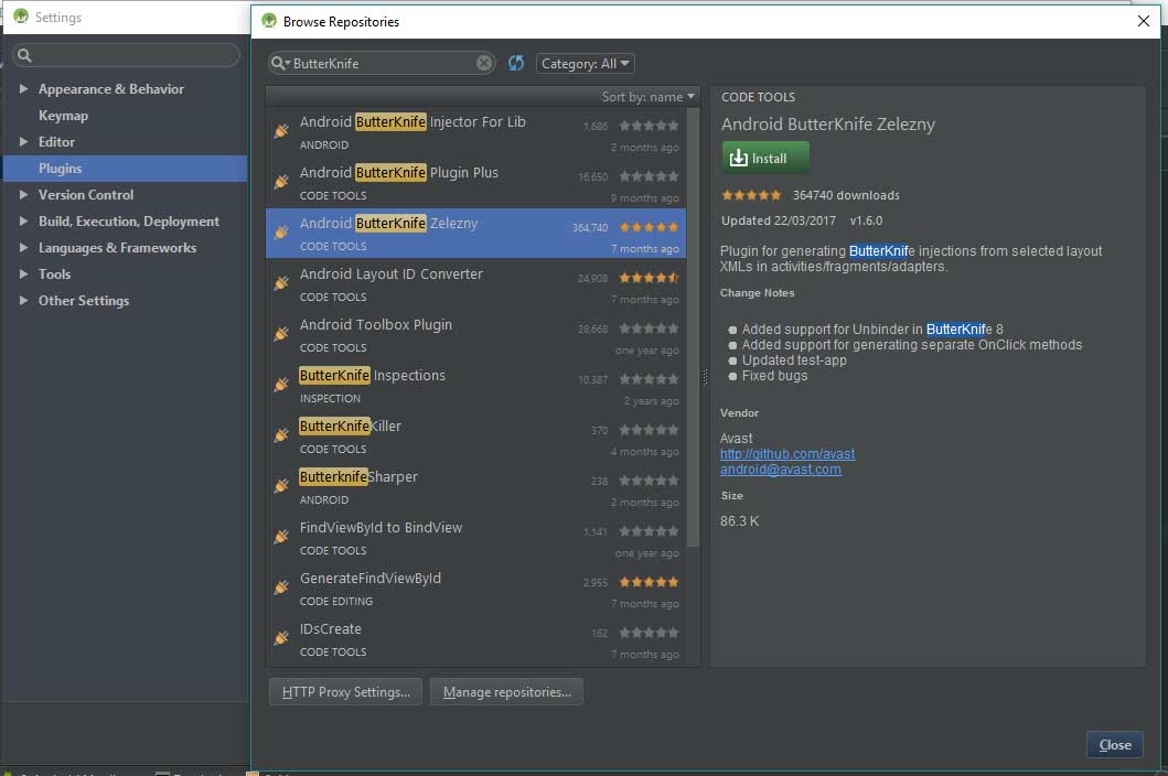 ۳- در قسمت search عبارت ButterKnife را تایپ کرده گزینه Browse repositories... را کلیک کنید تا پلاگین های مربوطه را پیدا کند سپس مطابق تصویر زیر آیتم Android ButterKnife Zeleny را انتخاب و install