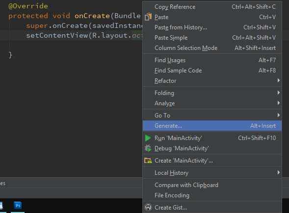 حالا پلاگین ButterKnife برروی اندروید استودیو شما نصب شده میتوانید و به راحتی از آن استفاده کنید تنها کافی است در اکتیویتی یا فرگمنت خود برروی layout resource ID یا همان id فایل xml خود کلیک راست کرده و گزینه Generate.. یا کلید میانبر Alt + Insert را کلیک کنید