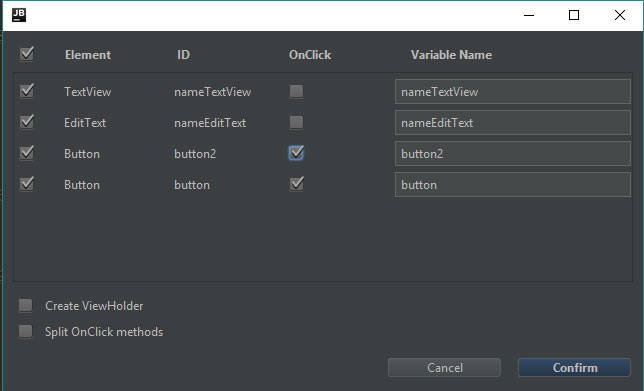 سپس پنجره ای برای انتخاب view های درون فایل xml انتخابی به شما نمایش داده میشود که هرکدام را که میخواهید bind شود باید انتخاب کنید همچنین انوتیشن onClick برای هرکدام که مورد نیاز بود