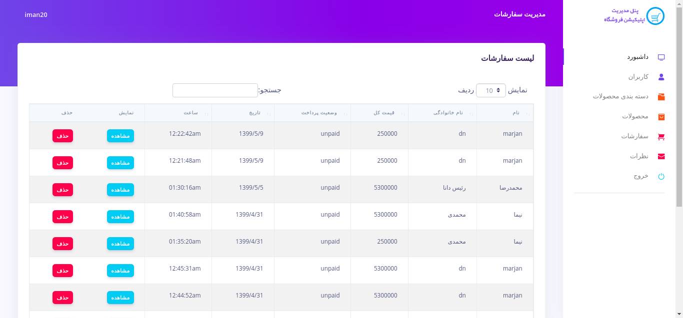 در پنل ادمین، کاربری که به عنوان ادمین سیستم در دیتابیس تعریف شده می تواند با نام کاربری و رمز عبور خود وارد شود و مدیریت کاملی برروی کاربران، دسته بندی محصولات، سفارشات، نظرات و آماری از تعداد محصولات و سفارشات و ... داشته باشد.