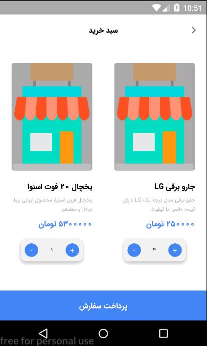 پروژه اپلیکیشن اندروید فروشگاه لوازم خانگی به هدف ارائه و فروش (مجازی) لیستی از لوازم های خانگی که داده آنها از جمله نام و عکس و … از سمت سرور با Api دریافت کرده و با UI زیبا نمایش می دهد. کاربر می تواند بین دسته بندی های کالاها که از پنل مدیریت مشخص شده جابجا شده و کالاهایی که در اپلیکیشن می بیند را به هر تعداد به سبد خرید خود اضافه کند و درنهایت به درگاه تست زرین پال جهت انجام پرداخت تست هدایت شود.