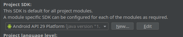 خواهید دید Project SDK خالی ست و همین دلیل شناخته نشدن شبیه ساز های شماست ،پس لیست کشویی را باز کنید و نسخه platform مورد نظر خود را انتخاب کنید و سپس ok.