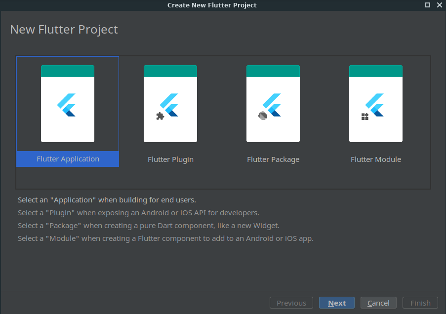 سپس درون مرحله بعد باید یکی از انواع پروژه فلاتر را انتخاب کنیم که توضیح هر کدام را هم زمان انتخاب فعال میکند