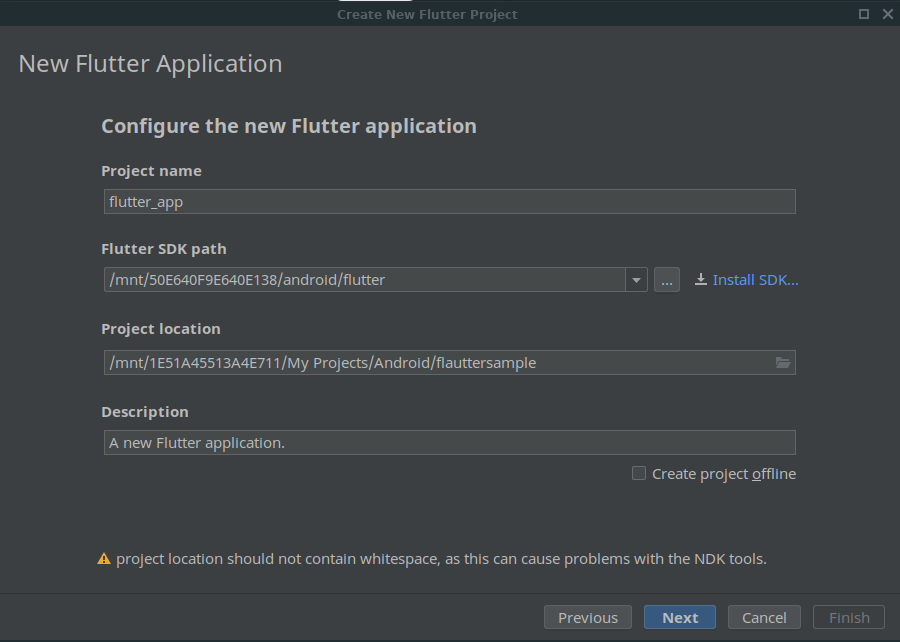 خب مشخصا ما در اینجا گزینه Flutter Applicaion را انتخاب میکنیم ، سپس در مرحله بعد ساخت پروژه فلاتر باید نام پروژه ، مسیر SDK فلاتر ، مسیر ذخیره سازی پروژه و توضیح درباره پروژه را وارد کنیم.(توجه کنید که مسیر SDK فلاتر درواقع همان فلاتری ست که براساس پلتفرم خود نصب کرده اید)
