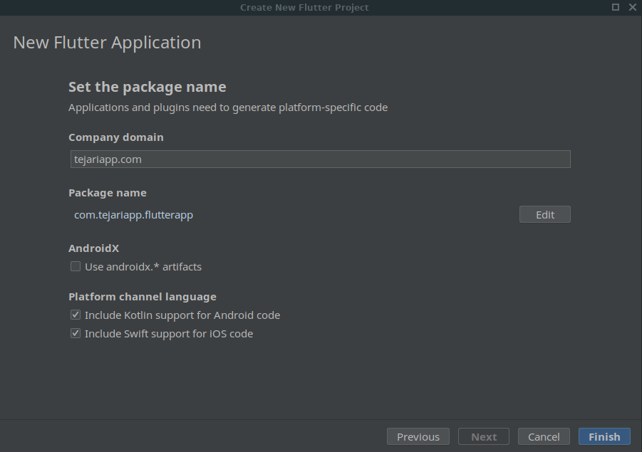 در مرحله بعد براساس نام کمپانی شما (یا هر نام دلخواه دیگر) package name شما ساخته میشود ،به علاوه میتوانید پروژه خود را با آ‌پشن های زیر تجهیز کنید: