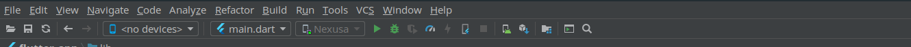 ما با فایل main.dart بیشتر کار داریم و دستورات را درون آن مینویسیم.در تولبار نیز Device و فایل اجرایی و گزینه هایی که قبلا هم در پروژه های اندروید از آنها بسیار استفاده کردیم مثل run ، debug ، avd و … مشخص است.